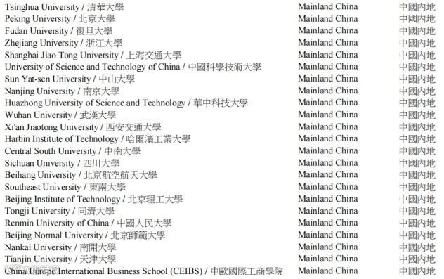 合资格大学颁授的硕士或博士学位与STEM学科有关,即科学、科技、工程或数学中国内地合资格大学有: