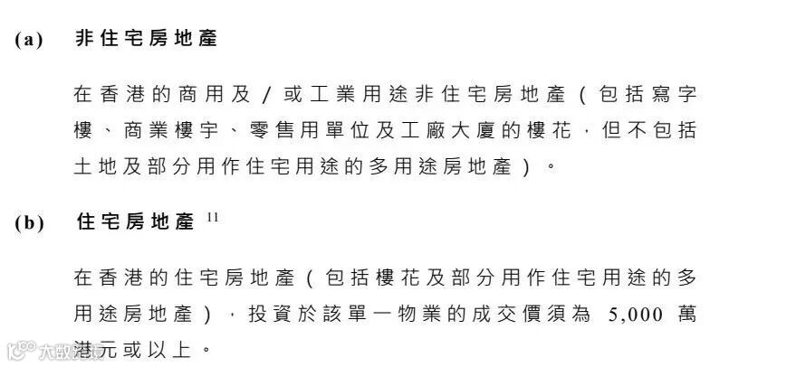 该物业成交价须为【5,000万元或以上】,投资于房地产获计算入投资总额上限为1,000万元;