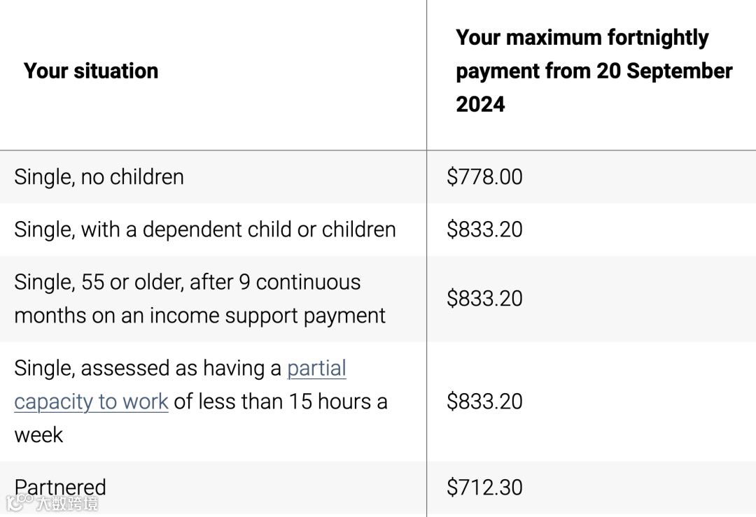 有伴侣的求职者:每两周增加14澳元,每人每两周可获712.30澳元,两人共计1424.60澳元。单身求职者如果经评估每周工作能力少于15小时,每两周可获833.2澳元,如果算上能源补贴和药品津贴则有849.50澳元。
