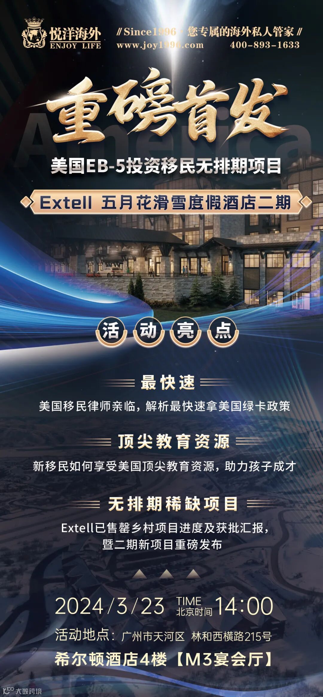 悦洋海外一向对EB-5项目都是严格把关,有效保障身份的获批率和投资额的返还率!与Extell是合作已久,多个项目的投资人基本能顺利拿到绿卡,投资款也在陆续返还!这次继续联合推出Extell五月花酒店二期项目,并于3月23日下周六举办盛大的发布会,届时将邀请美国EB-5的资深律师、教育专家莅临现场全局解析,如何快速拿到美国绿卡,如何使用绿卡助力子女上藤校,都会给每个客户详细分析!尊享名额,速度预定!