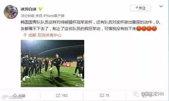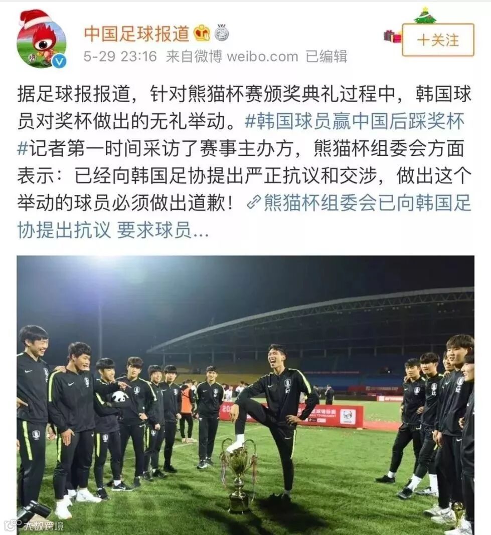 另据足球报官微消息,针对熊猫杯赛颁奖典礼过程中,韩国球员对奖杯做出的无礼举动。记者第一时间采访了赛事主办方,熊猫杯组委会方面表示:已经向韩国足协提出严正抗议和交涉,做出这个举动的球员必须做出道歉!