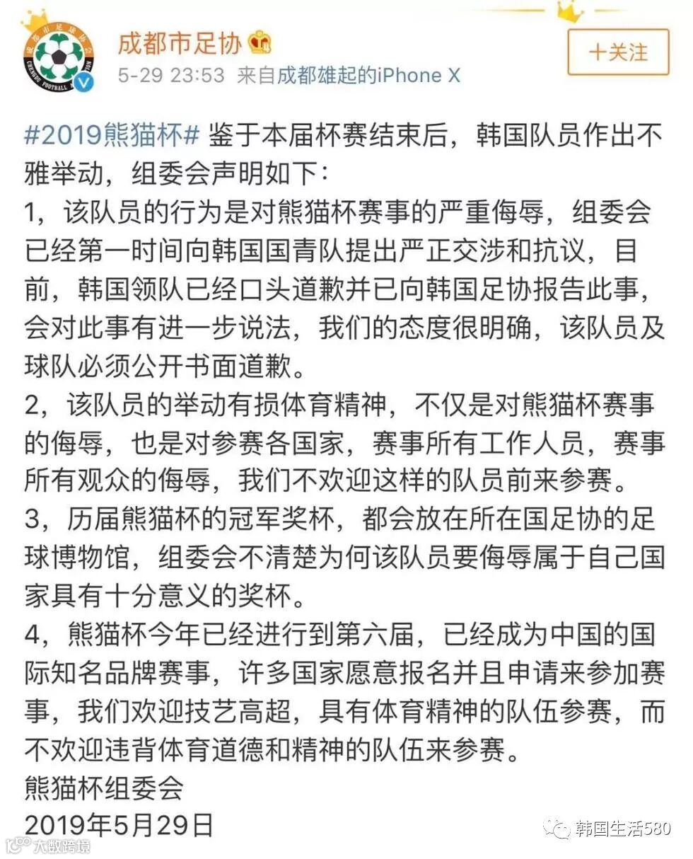 成都市足协29日也发布微博回应,称韩国队员及球队必须公开书面道歉,以下为成都市足协微博全文: