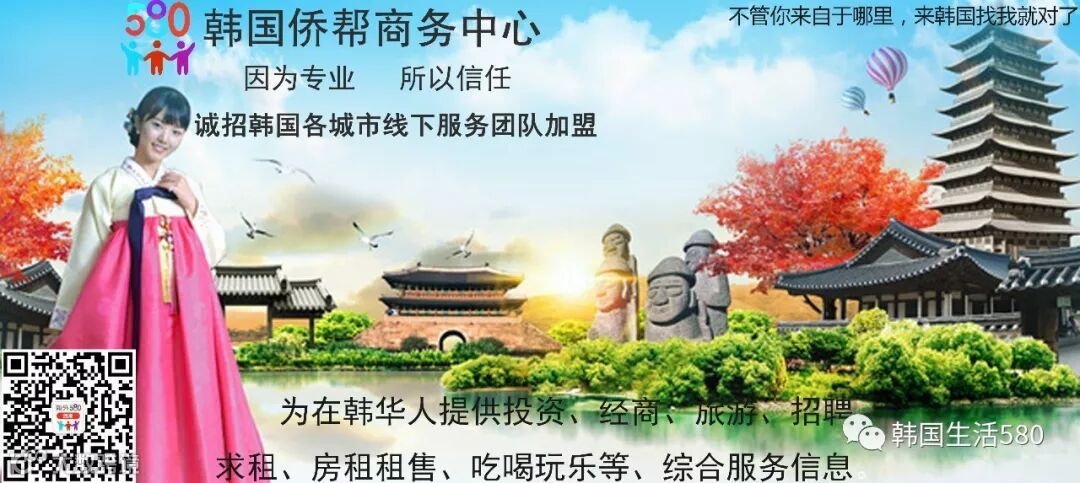 韩国580--是韩国影响力最大的便民平台,为在韩华人提供投资,经商,旅游,招聘求组,房屋租售,吃喝玩乐等综合服务信息。并且在韩国拥有线下实体服务团队,我们专业和效率将使您在韩国生活和投资更加美好!