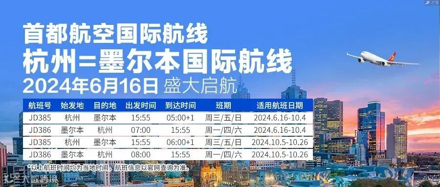 首都航空将会在2024年的6月16日重启墨尔本直飞杭州的航线。每周计划会增加3班直飞航班。