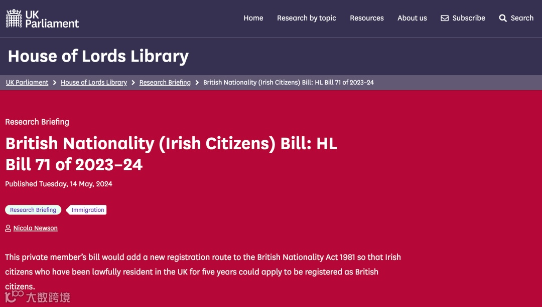 《英国国籍(爱尔兰公民)法案》于2024年5月17日在英上议院进行二读。该法案将在《1981年英国国籍法》(British Nationality Act 1981)的基础上增加一条新的入籍途径,这样在英国合法居住满5年的爱尔兰公民,无需任何考试或其他要求,就可以申请注册成为英国公民。