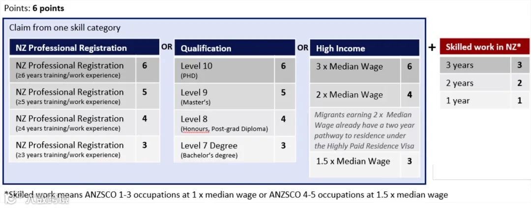 6分制的6分可以来自“学历”、“职业注册”以及“收入”3个技能指标其中的一项,不得累加,如果所选技能指标不够6分,则需要通过在新西兰的技能工作经验进行加分,每一年工作经验获得1分。