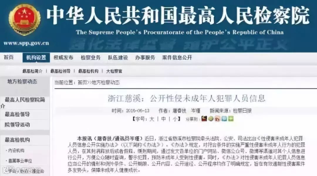 2016年6月,慈溪市检察院牵头法院、公安、司法出台《性侵害未成年人犯罪人员信息公开实施办法》,对符合条件的实施严重性侵害未成年人行为的犯罪人员,在其刑满释放后或者假释、缓刑期间,通过发文各单位的门户网站、微信公众号、微博等渠道对其个人信息进行公开,方便公众随时查询,警示犯罪,预防未成年人受到性侵害。