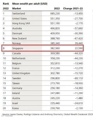 在全球财富报告中,2022年新加坡人的总财富将达到1.9万亿美元(2.58万亿新元),人均财富增长了6.26%,达到了惊人的38万2957美元,成功跻身全球第八的位置,较上一年增长了两个名次。