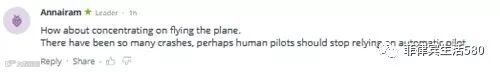 还有人提醒这名飞行员“集中注意力”,“发生过这么多的空难,也许飞行员们应该停止依赖(飞机)自动驾驶仪”。↓