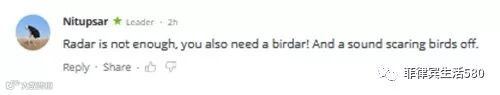 视频上传后,有网友打趣说,现在飞机有雷达都不够,还需要一个“鸟达(birdar)”,发出声音把小鸟吓跑。↓