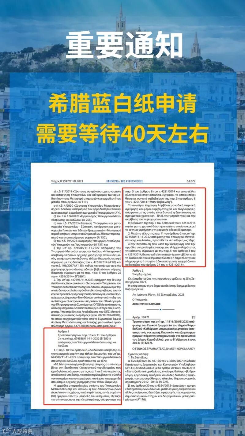 根据希腊移民局消息:自2023年9月25日起,申请人在递交希腊黄金居留申请后,将不会立即获得电子居留申请确认书又称“等待纸”、“蓝白纸”。移民局将对申请者的材料进行进一步审核,等待纸(蓝白纸)将在申请材料提交后的40天内发放。