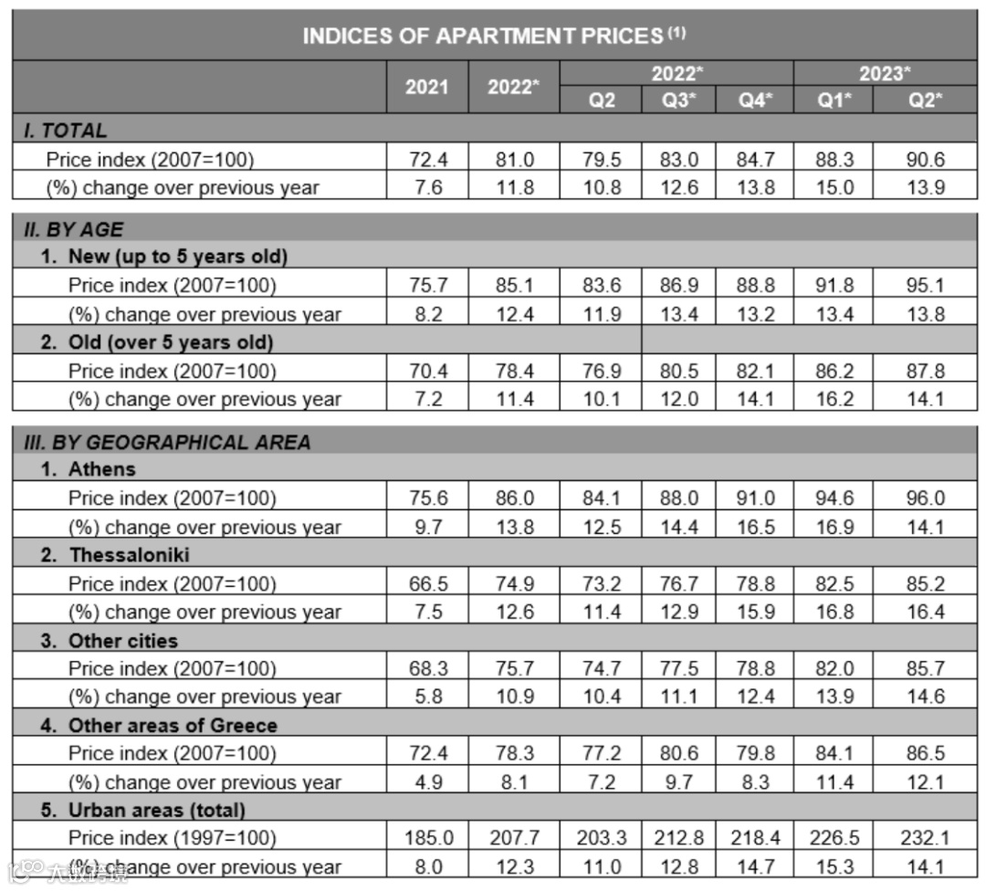 希腊央行9月12日发布的最新数据显示,2023年第二季度,全国公寓价格上涨了13.9%,其中新房上涨13.8%,二手房上涨14.1%。