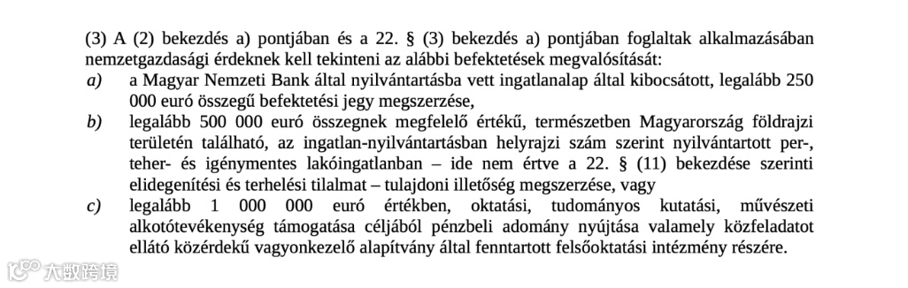 投资至少25万欧元房地产基金,40%资金在匈牙利居住房地产,基金必须为在匈牙利国家银行注册的房地产基金发行的投资单位,保持5年。