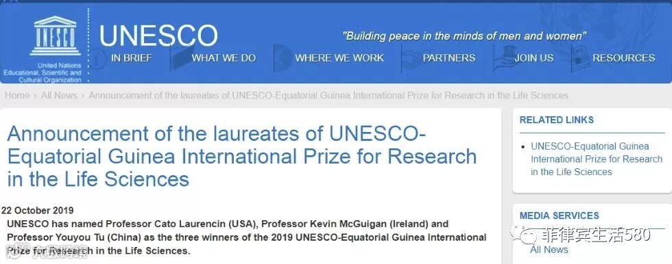 中国日报网10月23日电(胡雨濛)10月22日,总部位于法国巴黎的联合国教科文组织公布2019年度联合国教科文组织-赤道几内亚国际生命科学研究奖(UNESCO-Equatorial Guinea International Prize for Research in the Life Sciences)获奖名单,共3人获奖,其中包括来自中国的屠呦呦。