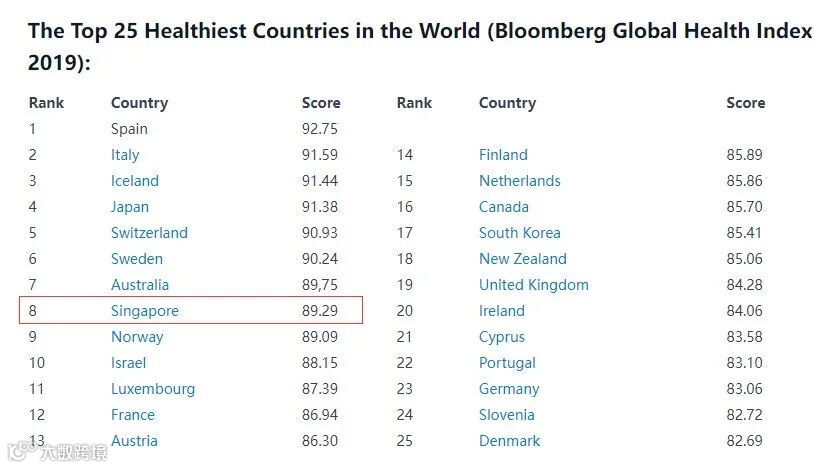 联合国世界卫生组织和世界银行发布了以健康相关指数为基础的“世界最健康的国家”2019排行榜,其中,新加坡排在第8位!