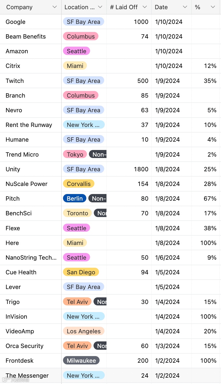 根据专业追踪裁员动态网站layoffs.fyi的数据统计,从2024年1月2日元旦小长假复工第一天起,一共有20家美国公司宣布裁员,行业横跨高科技、零售业、金融、物流、旅游、能源、医疗保健等多个领域。
