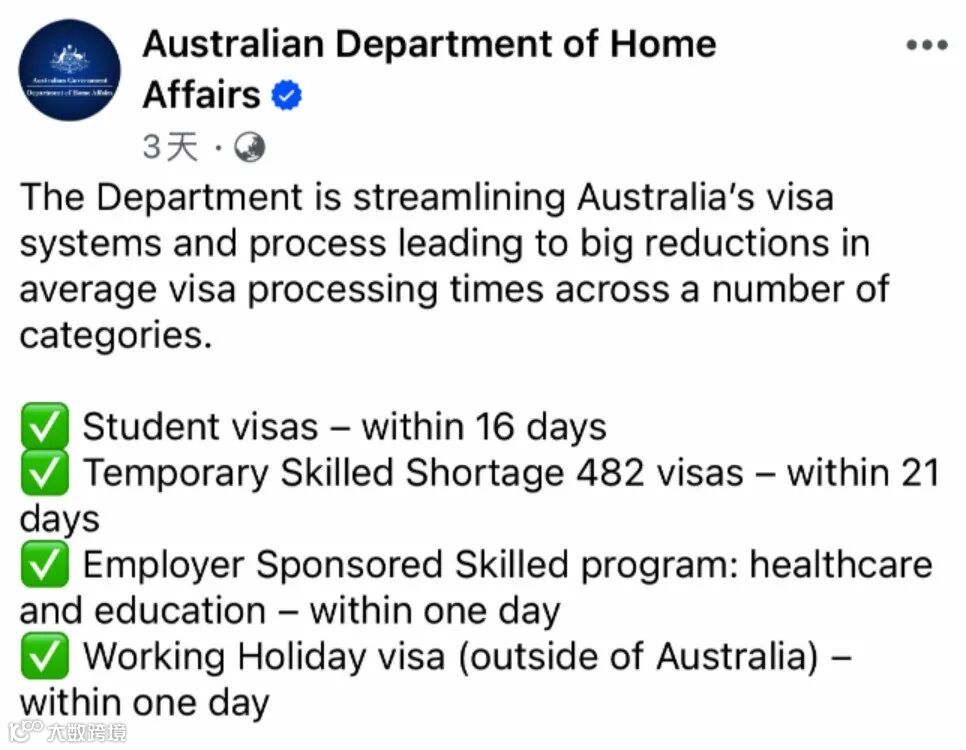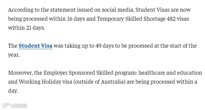 另外澳洲内政部在本月早些时候表示:“该部门正在简化澳洲的签证系统和流程,从而大幅缩短多个类别的平均签证处理时间。”