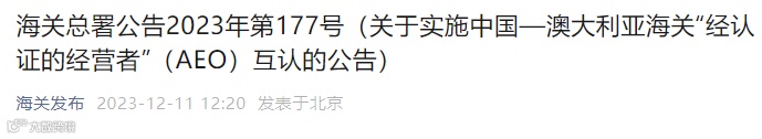 根据澳中两国海关发布的消息,自2023年12月14日起,两国的“AEO”(Authorized Economic Operator,经认证的经营者)互认协议正式生效。