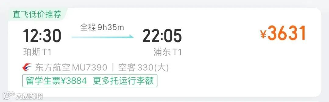 根据票务网站搜索的结果,现在珀斯直飞上海的航班:机票价格为¥3631!