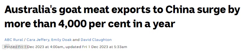 澳洲广播公司最近报道称,由于中国消费者需求激增,澳洲山羊肉在过去一年中对中国的出口激增了4000%以上。