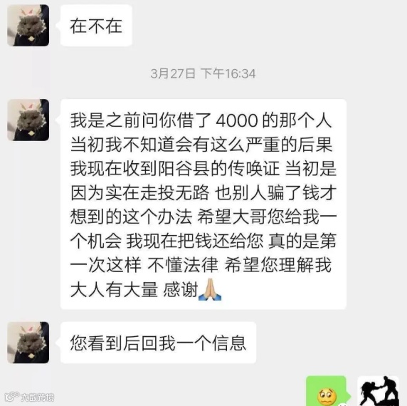 4月8日晚,经过一周的思想斗争后,嫌疑人雷某某终于加了办案民警张警官的微信,张警官告知雷某某案子已经立案,来阳谷投案自首是他唯一的出路,争取宽大处理。