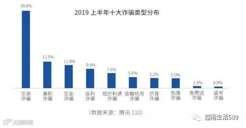 通过对用户举报情况的盘点分析,《报告》整理出了2019上半年十大诈骗类型,诈骗场景呈现多样化;由于网络购物和网络支付的普及,交易诈骗占比遥遥领先,是最为高发的诈骗类型。