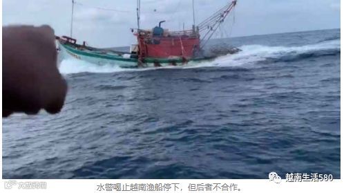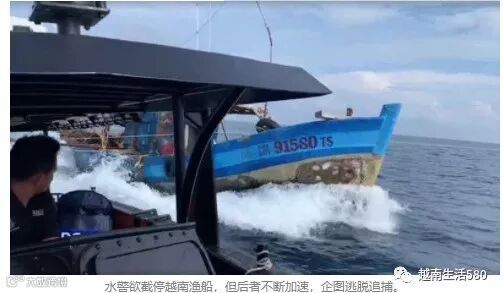 两艘越南渔船被我国水警发现犯境捕鱼后,立即开船潜逃,水警开着巡逻艇紧追在后,响起警号并喝止舵手立即停船,但渔船不但没有停下,还不断加速,在巡逻艇追上并准备拦截时,其中一艘渔船竟逞凶,图撞巡逻艇。