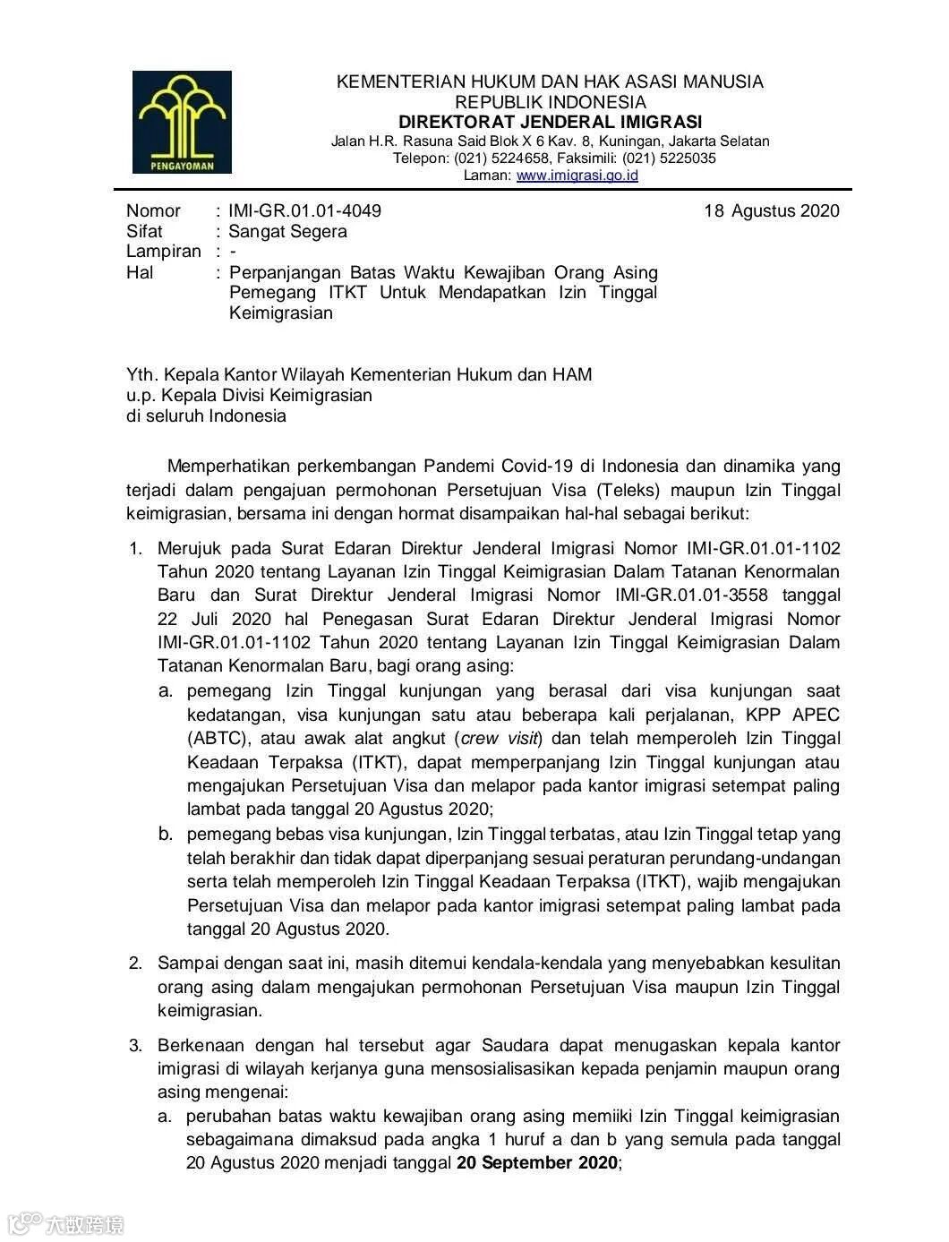2. 对于已过期和不能延长的免签证,有限居留许可,长期居留许可,并已获得获得紧急居留许可(ITKT),须申请签证批准并在2020年8月20日之前向当地移民局报告。