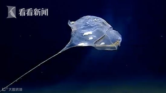 这只生物头部圆圆的,拖着一条长尾巴,外形很像水母。从远处看,很像是一名拖着降落伞的伞兵。更怪异的是,它的全身会发出美丽的蓝光,让人着迷。