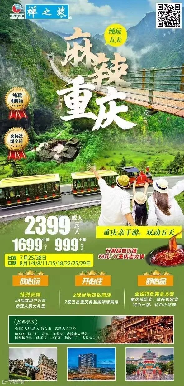 —— 网红重庆《5A洪崖洞、解放碑,李子坝穿楼车、磁器口》,武隆三大5A《仙女山、天生三桥、大裂谷》、世界之最《4A彭水九黎城》、《816地下核工程》、《鹅岭二厂》、《人民大礼堂》...