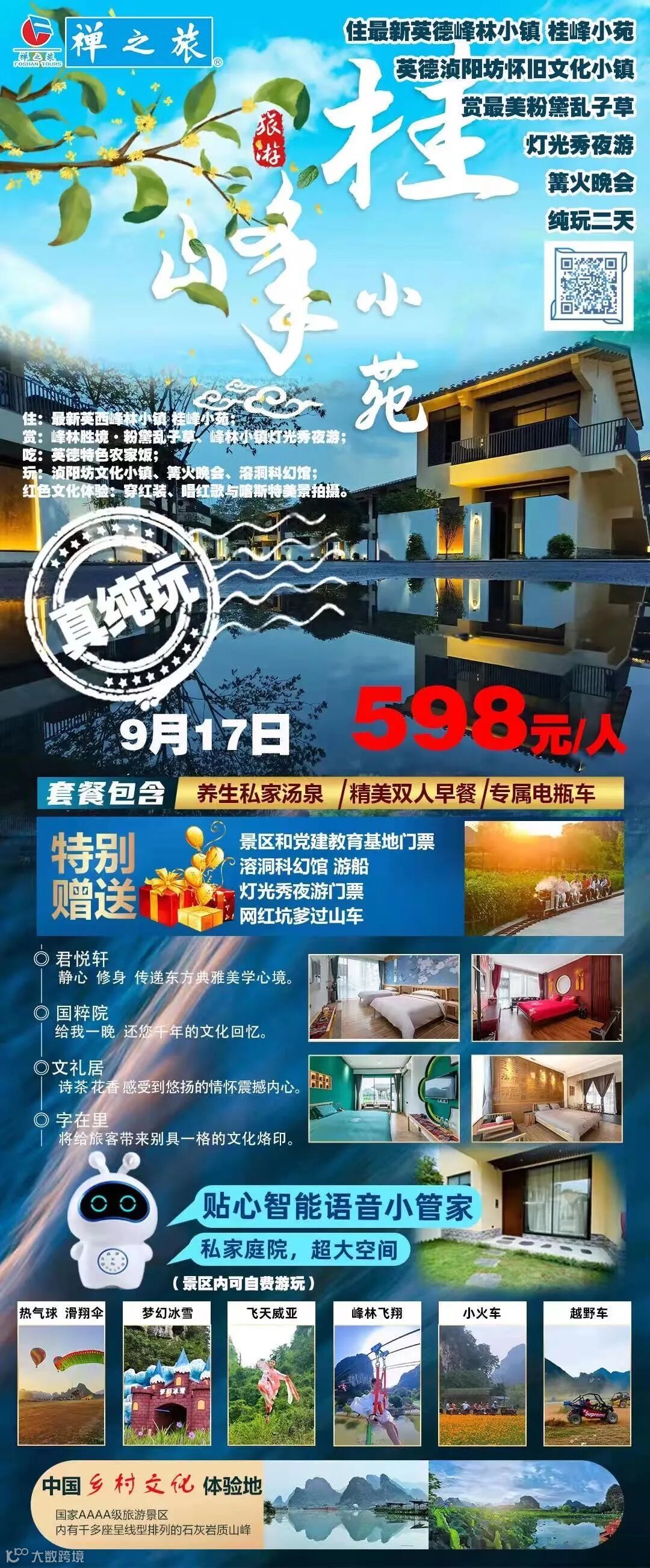 【住最新英德峰林小镇 桂峰小苑】英德浈阳坊文化小镇、赏最美粉黛乱子草、灯光秀夜游、篝火晚会纯玩二天