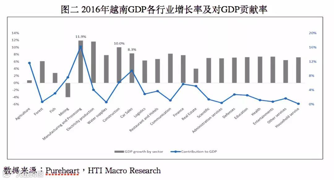 而从产业结构来看,越南GDP贡献最大的行业是制造业。