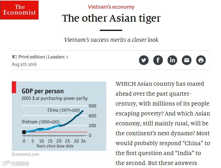 英国老牌商业杂志《经济学人》早在2016年就称赞:越南将成为另外一只“亚洲虎”。即类似于泰国、马来西亚、菲律宾、印度尼西亚等“亚洲四小虎”,实现经济长足发展。