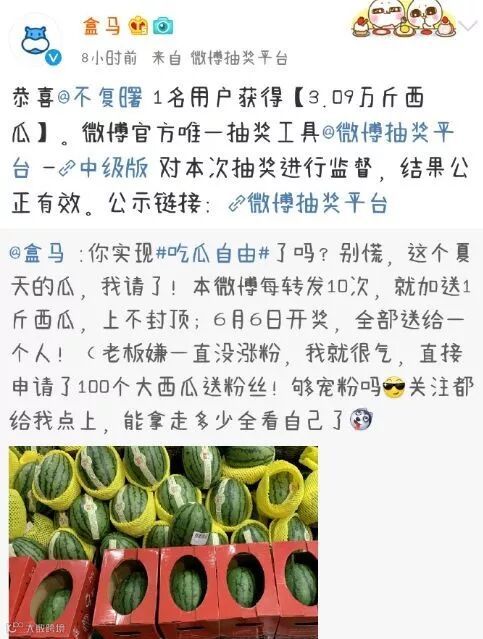 近日盒马发起了西瓜的抽奖活动,“每转发10次加送1斤”,这条微博被广大网友加码到了3万斤西瓜昨天深夜开奖,中奖者微博瞬间被攻陷了:快醒醒,起床吃西瓜了!网友:“这是唯一一个没中奖但看别人中奖也很开心的抽奖”“哈哈哈哈哈哈哈就很惨”“可以换成钱吗?就是这么俗”“看来先要瞅瞅附近哪里适合摆摊卖瓜了,不然吃一年都吃不完”“一块钱一斤都能卖三万”