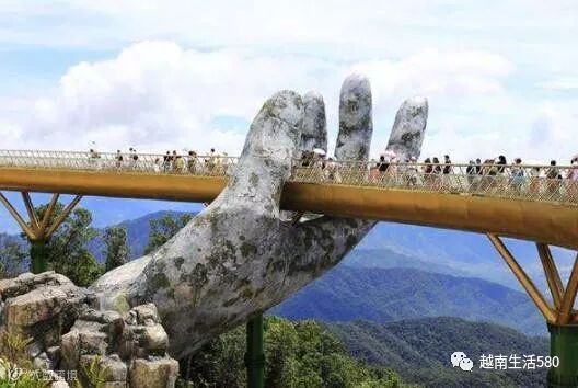 越南岘港外的一座新桥近日爆红网络,这座桥被称为金桥,位于海拔1400米以上的巴那山之上,看起来好像是被两个巨大的石手捧在高处。在桥上,游客们可以欣赏无限的美景与雄伟壮阔的巴那山。虽然手看起来像是用石头雕刻的,但实际上不是。园林公司工作人员称:“我们设计了手的骨架,用钢网覆盖它们。