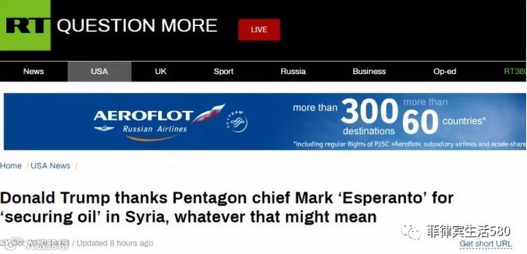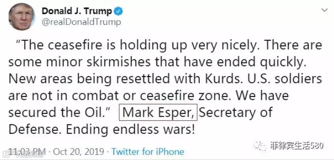 特朗普在推文中这样写道,“马克·埃斯珀说,‘停火(状态)维持得非常好。期间出现过一些小冲突,但很快就结束了。(我们)与库尔德人正在重新确定定居点。’美军士兵不在战斗区或停火区。我们确保了石油的安全,(现在)正在带士兵回家!”↓