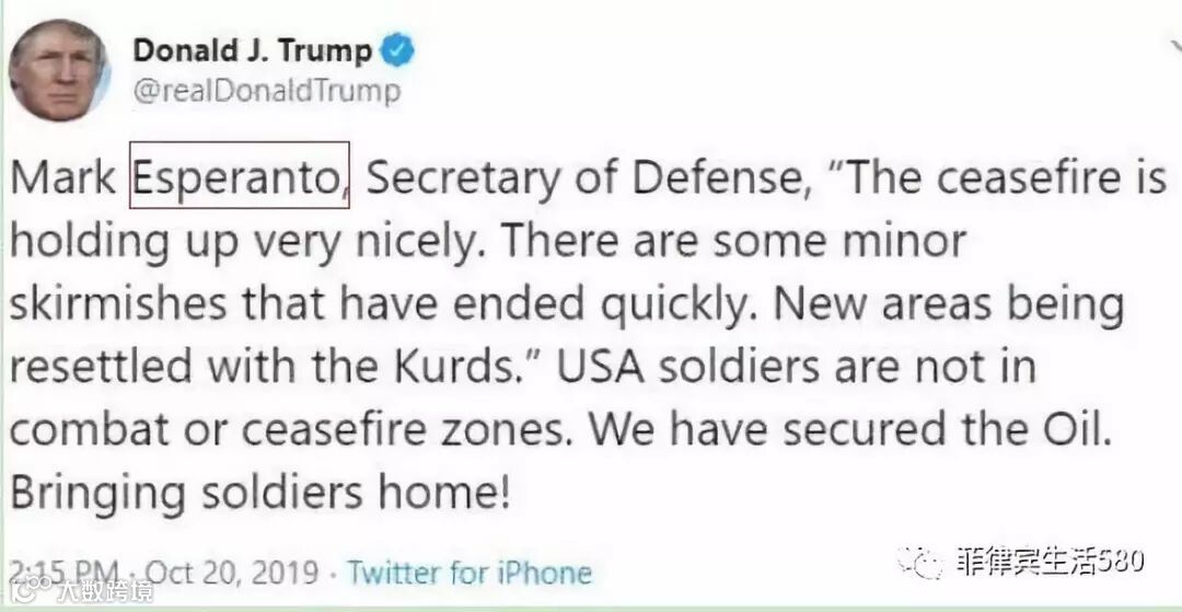 又拼错了?当地时间10月20日,美国总统特朗普在推特上盛赞国防部长马克·埃斯珀在叙利亚的工作成果。然而尴尬的是,他却拼错了这位国防部长的名字,将埃斯珀(Esper)写成了“世界语”(Esperanto)。