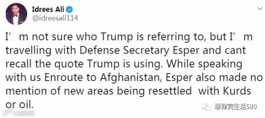 阿里发推称,“我不确定特朗普指的是谁,但我和国防部长埃斯珀一起出访,(我)不记得(埃斯珀说过)特朗普引用的那句话。在前往阿富汗的途中,埃斯珀与我们交谈时也没有提到与库尔德人重新安置定居点和石油问题。”