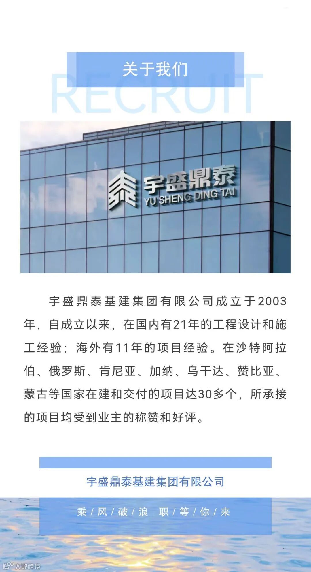 宇盛鼎泰基建集团有限公司成立于2003年,自成立以来,在国内有21年的工程设计和施工经验;海外有11年的项目经验。在沙特阿拉伯、俄罗斯、肯尼亚、加纳、乌干达、赞比亚、蒙古等国家在建和交付的项目达30多个,所承接的项目均受到业主的称赞和好评。