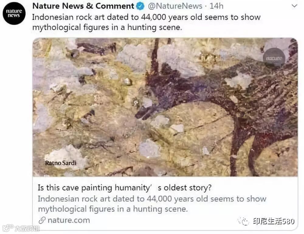 12月12日, 据外媒报道,印度尼西亚一幅描述史前狩猎场景的洞穴壁画可能是世界上最古老的具象艺术品,其历史可追溯至近44000年前。