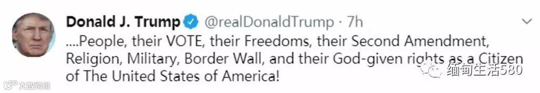 特朗普又进一步解释了具体是哪些权利,“他们(人民)的投票权,他们的自由,他们的第二修正案、宗教、军事、边境墙,以及上帝赋予他们的、作为美利坚合众国公民的权利!”