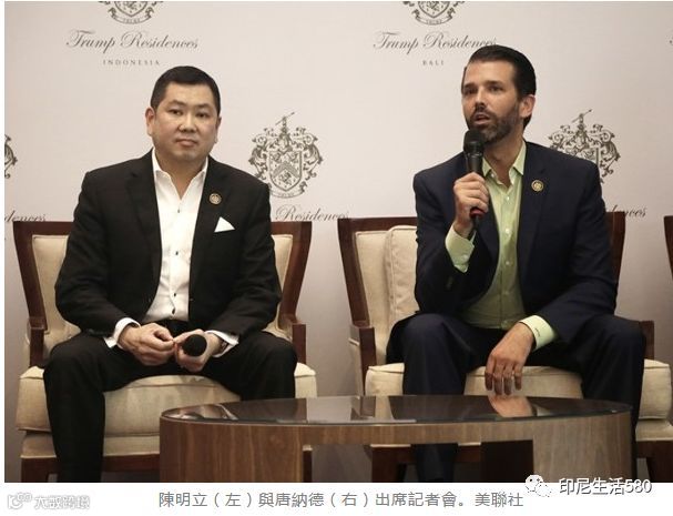 东网报导,美国总统川普的儿子、川普集团行政副总裁唐纳德,和印度尼西亚华裔地产商陈明立(Hary Tanoesoedibjo),13日在印度尼西亚首都雅加达共同出席记者会。