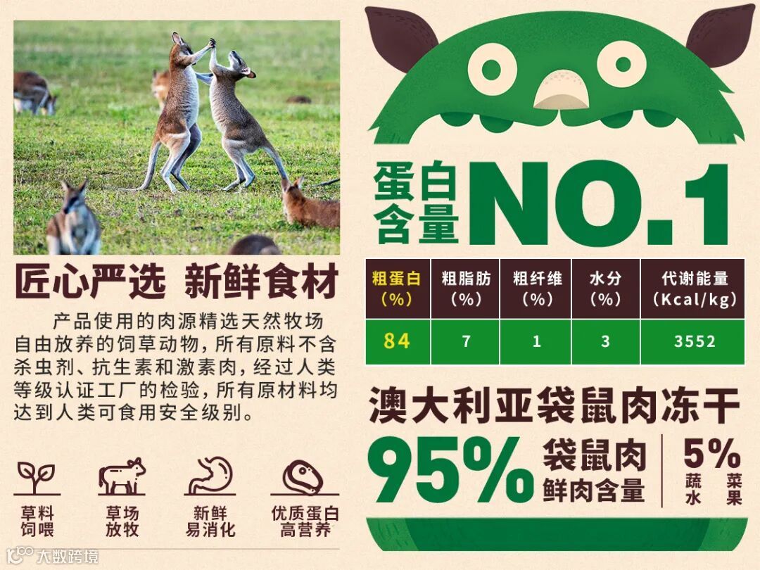 袋鼠肉是世界上最瘦的红肉蛋白之一,富含易消化蛋白,低脂肪,是需要低脂饮食和超重宠物的首选美食!