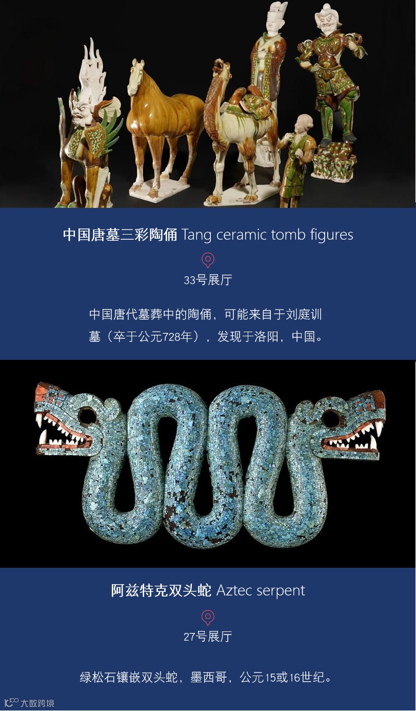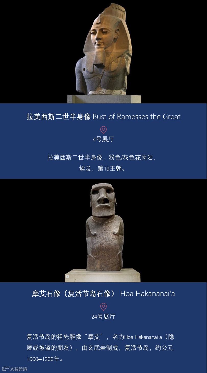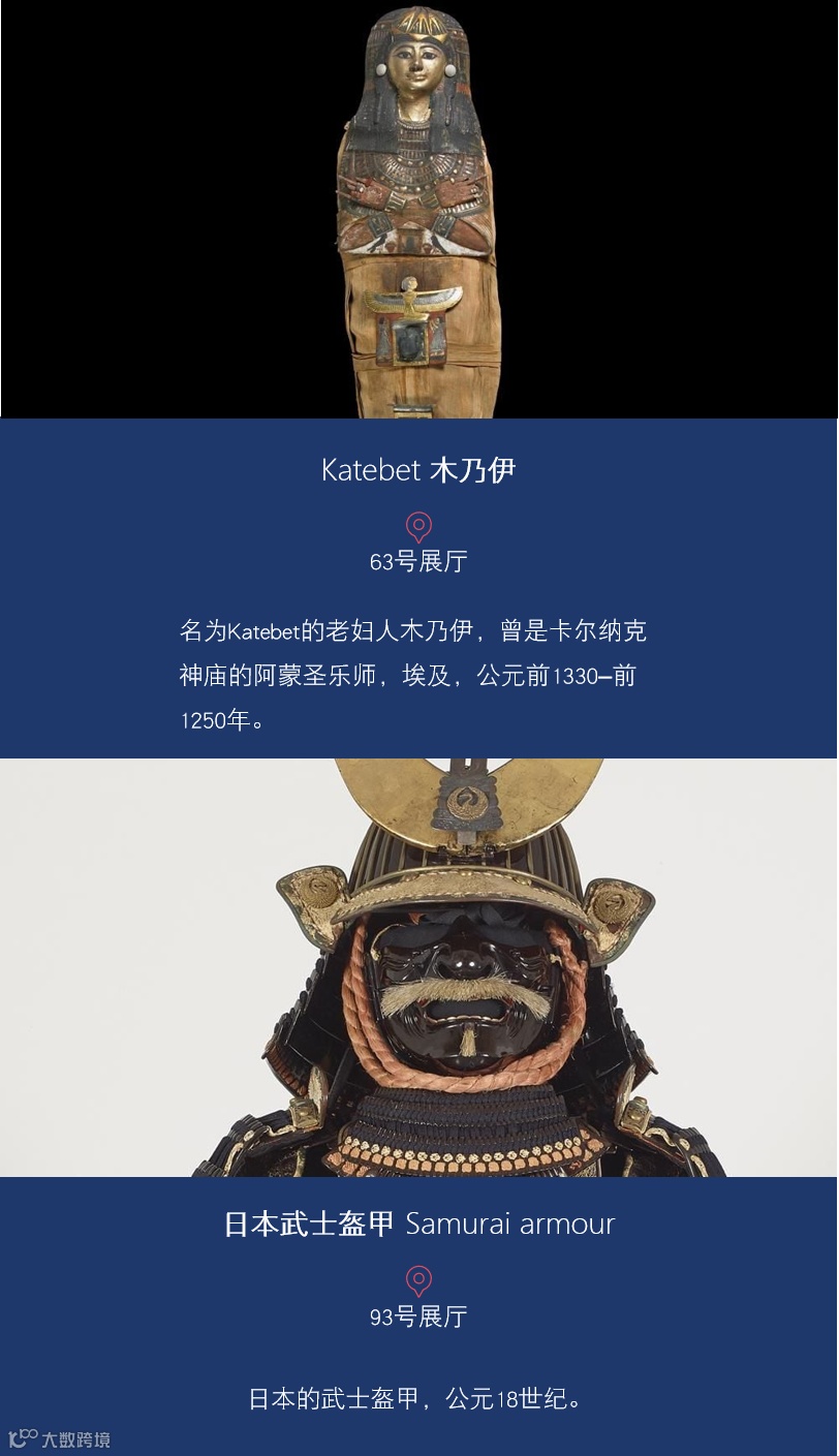 展厅数量:超过100个,按地区和主题分布,涵盖古埃及、希腊罗马、亚洲、非洲等文明。