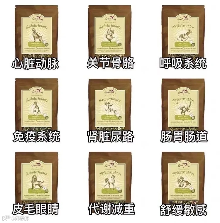 泰拉草药系列由Terra Canis与欧洲自然疗法学院教授以及环境医学院的兽医专家共同开发针对肠胃、应激、泌尿、免疫等10种典型常见的狗狗病症研制出的对症方:肠胃消化配方、舒缓敏感配方、护肤亮眼配方、关节骨骼配方、增强免疫配方、心脏血管配方、新陈代谢配方、呼吸系统等。