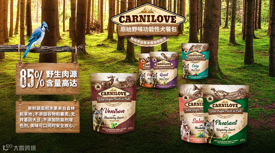 CARNILOVE功能性宠粮野生鲜肉含量高达85%,保证了宠物摄入充足的蛋白质;同时搭配功能性森林草本和浆果,丰富的天然营养素帮助预防疾病增强免疫。