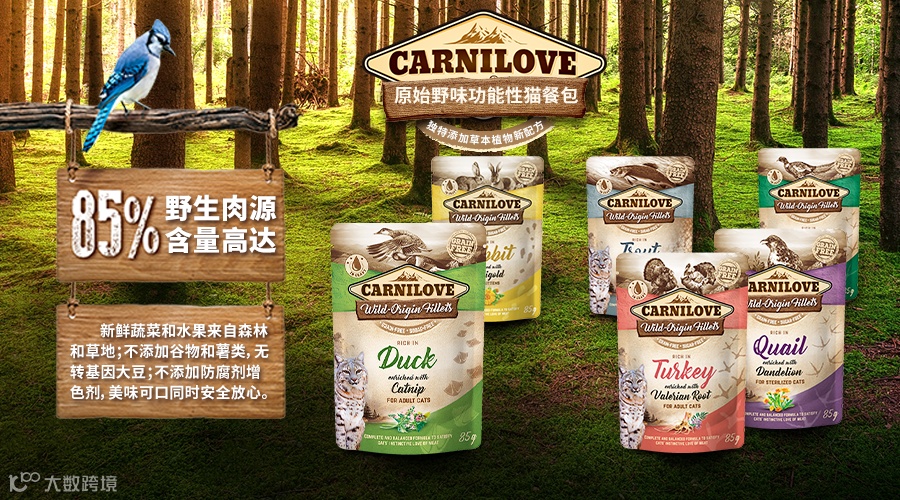 精心挑选多种营养丰富的野生肉源制作而成,搭配CARNILOVE猫粮可作为猫咪的完美饮食。