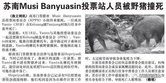 南苏门答腊省 Musi Banyuasin县投票站委员会(KPPS)小组传来噩耗,一位成员Yanto(30岁)在Keluang镇Tanjung村执行任务中意外死亡。
