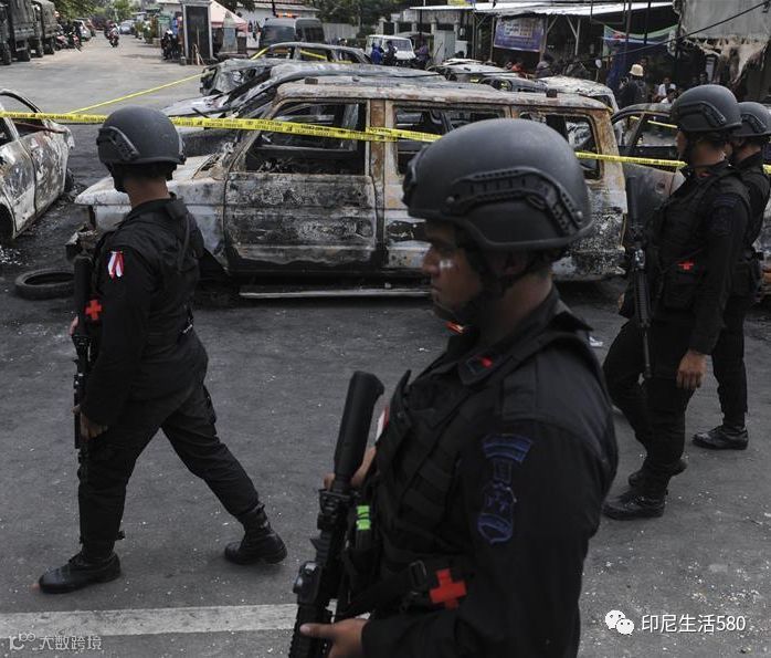 5月22日,在印度尼西亚首都雅加达,警察在被烧毁车辆旁执勤。印度尼西亚警方22日说,印尼首都雅加达个别地区21日晚和22日凌晨发生因对选举结果不满引发的骚乱,警方已经逮捕了69名嫌疑人。