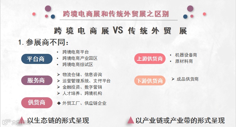 目前国内有许多的跨境电商展会,大致可以分成两种类型:❶ 平台展示型跨境电商展会❷ 贸易成交型跨境电商展会